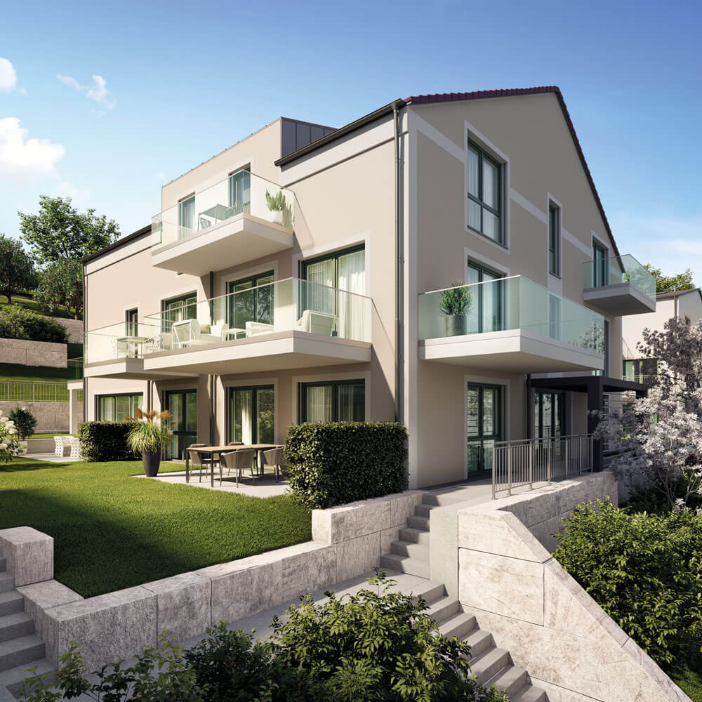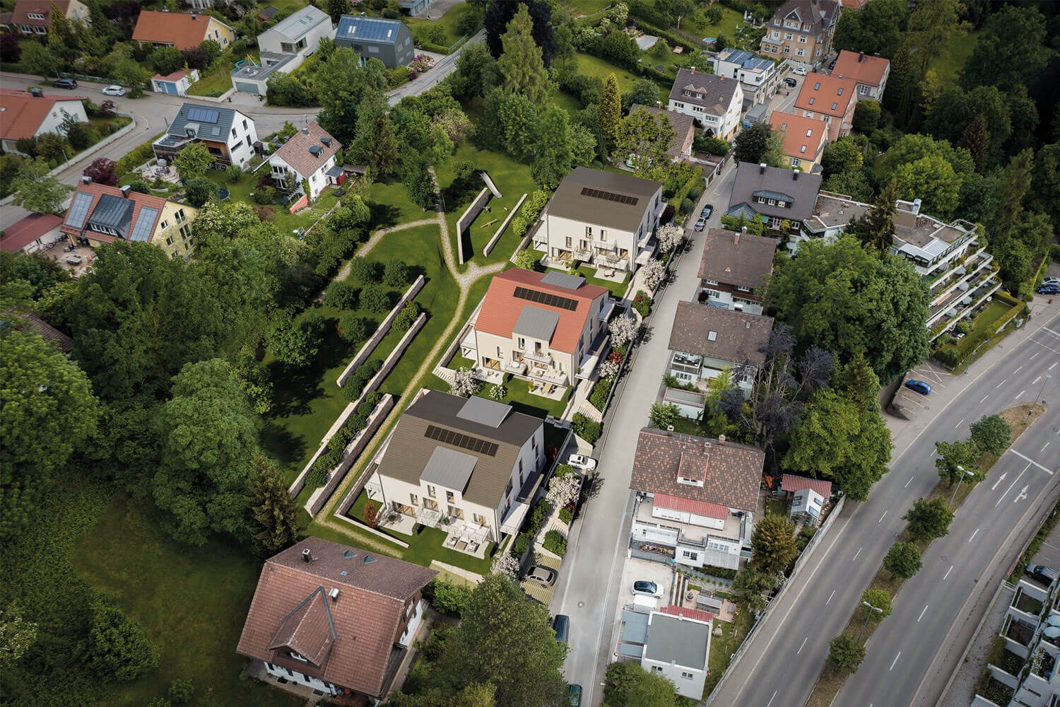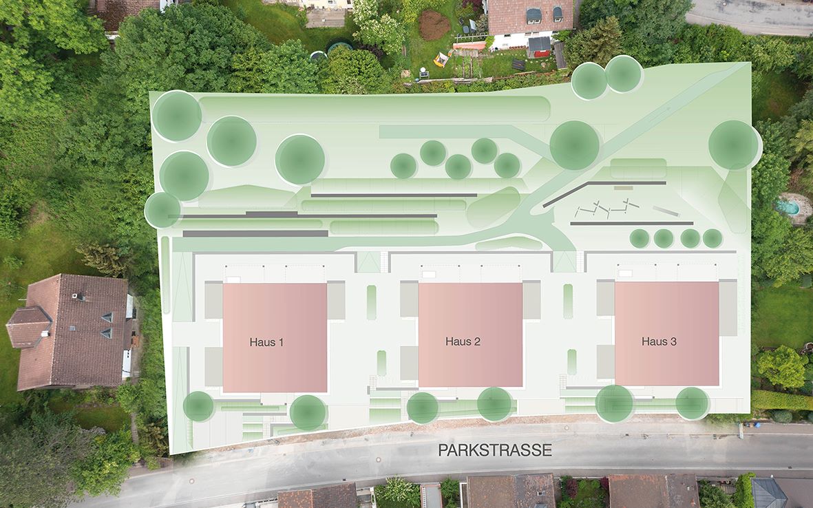 Zum einen gehören die Zuwegungen zu den einzelnen Häusern, sowie die Besucherparkplätze der Eigentümergemeinschaft. Weiter zählt der westliche Hang zum Gemeinschaftseigentum. Der Hang wird als naturnaher Garten angelegt, die Zuwegung ist nur für die Pflege durch den Hausmeisterservice angedacht. Der Weg zum privaten Spielplatz und der Bereich des Spielplatzes selbst kann von den Eigentümern genutzt werden.