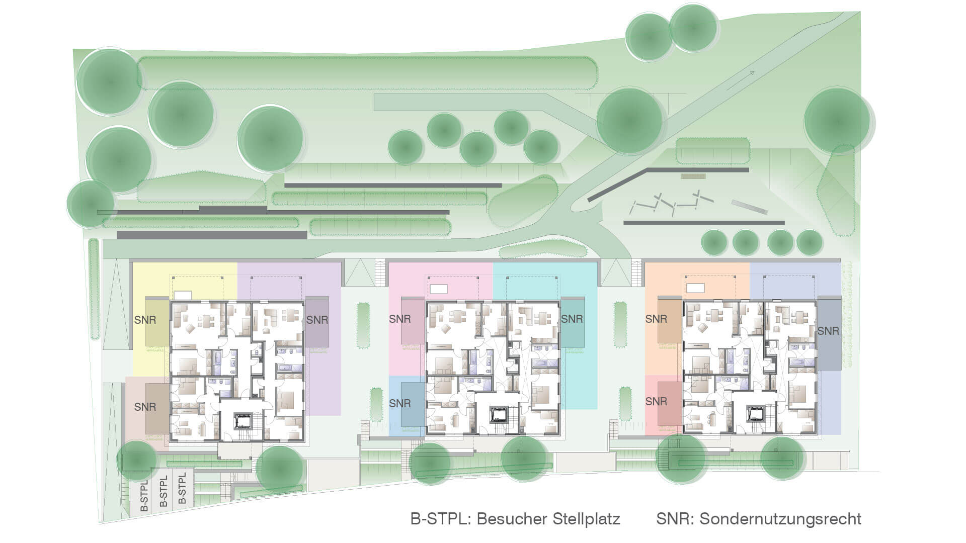 Die Sondernutzungsrechte (SNR) für die Erdgeschosswohnungen sind aus dem Aufteilungsplan ersichtlich und entsprechend farblich dargestellt. Sie sind den entsprechenden Wohnungen zugeordnet.